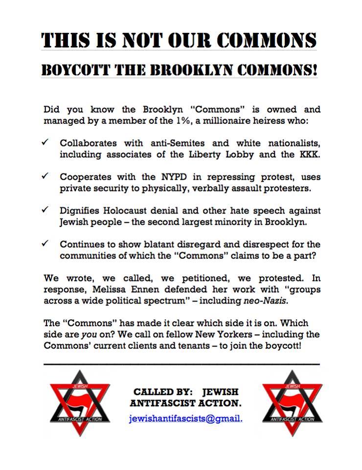 Boycott call, “This Is Not Our Commons: Boycott the Brooklyn Commons!,” https://jewishantifascists.files.wordpress.com/2016/09/boycott-flyer-final.pdf14520500_1766450156962303_2034150042052535935_n