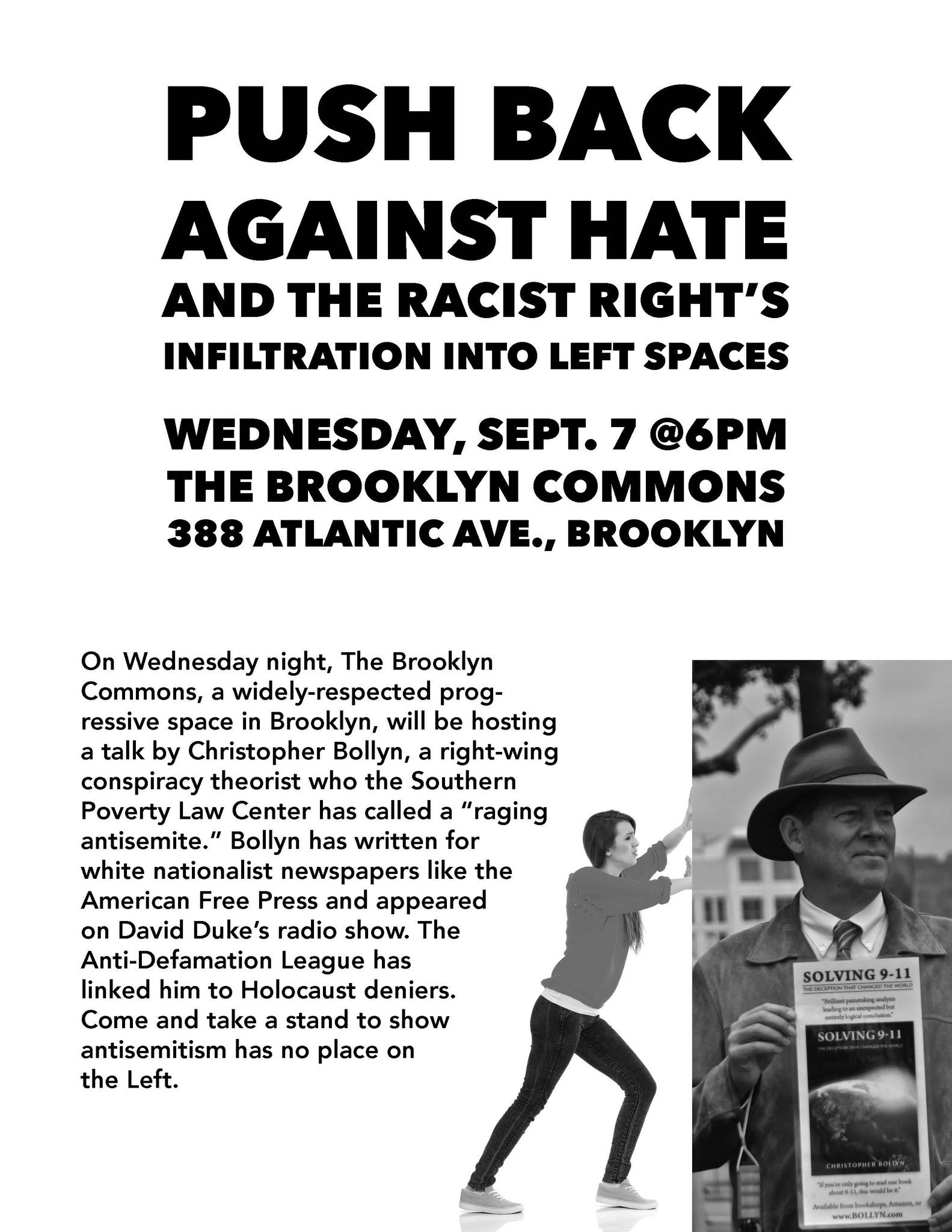 “Statement from Multiple Organizations on Christopher Bollyn Event at the Brooklyn Commons,” Brooklyn Institute for Social Research, September 4, 2016, https://thebrooklyninstitute.com/2016/09/04/statement-from-multiple-organizations-on-christopher-bollyn-event-at-the-brooklyn-commons.