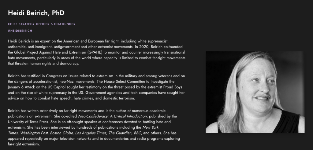 Beirich co-founded the Global Project Against Hate and Extremism to monitor transnational hate movements, was solicited to submit written testimony to the 1/6 Committee & is the former head of the SPLC Intelligence Project.