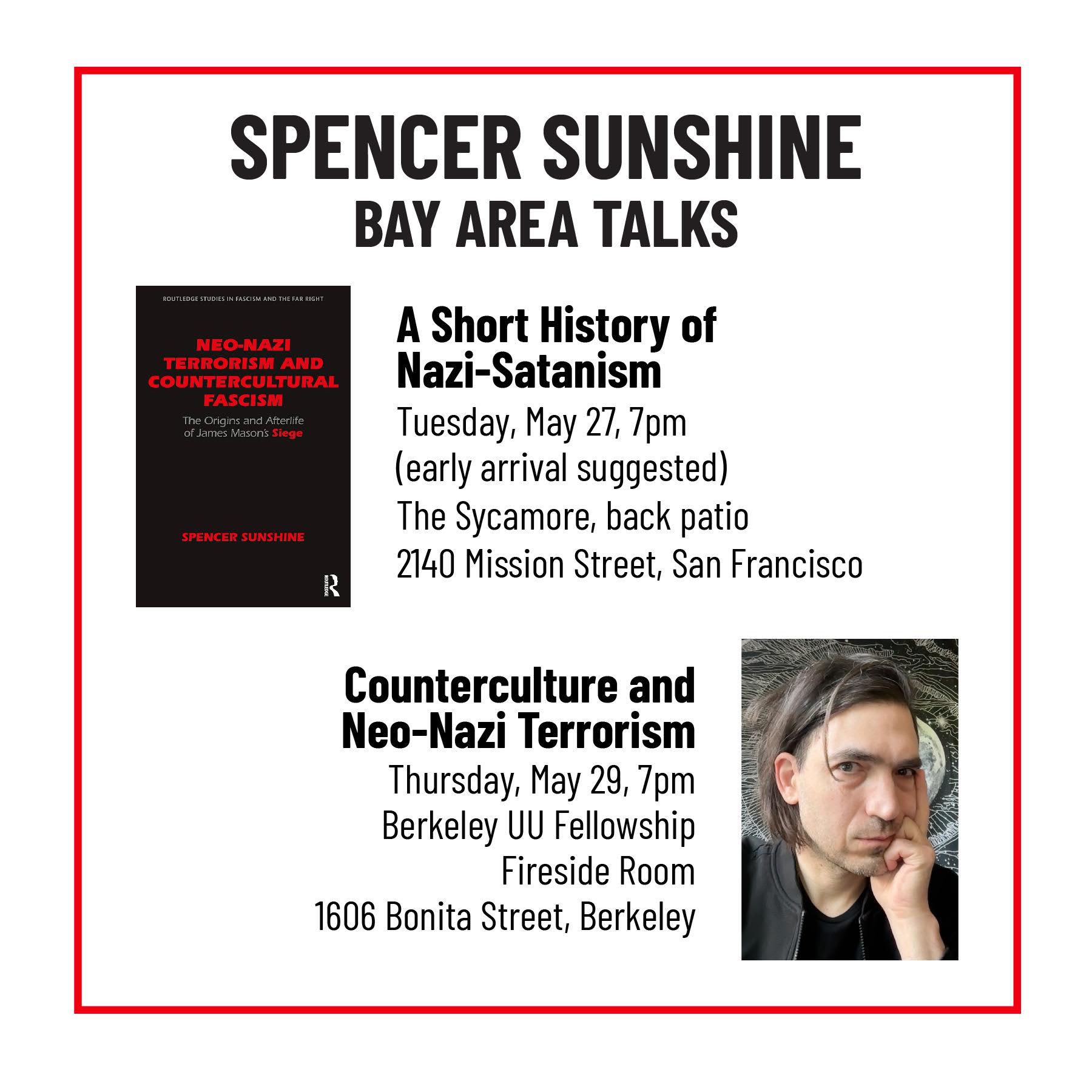 Just a reminder that next week I’ll be giving two talks in the Bay Area! The first is on Tuesday, May 27 in SF’s Mission district on the history of Nazi-Satanism. The second is in Berkeley on May 29, where I’ll talk about the role of 1980s/90s counterculture in the making of James Mason’s neo-Nazi terrorist tome Siege.